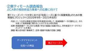 ふたつめの報告は、今年8月の東ティモール出張報告です。東ティモールプロジェクトの第2フェーズ立ち上げを目指して、石本事務局長が渡航したので、その時の様子をご報告しました。第2フェーズを始めるにあたっては、第1フェーズで得た成果(保健データマネジメントのスキル向上)をさらに発展させるとともに、地域の人々に直接裨益する方向で進めることとしました。今回の出張は、第2フェーズの方向性を具体化するための情報収集と関係機関との連携を図るのがねらいでした。