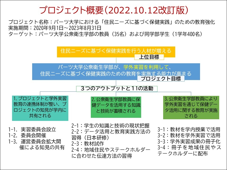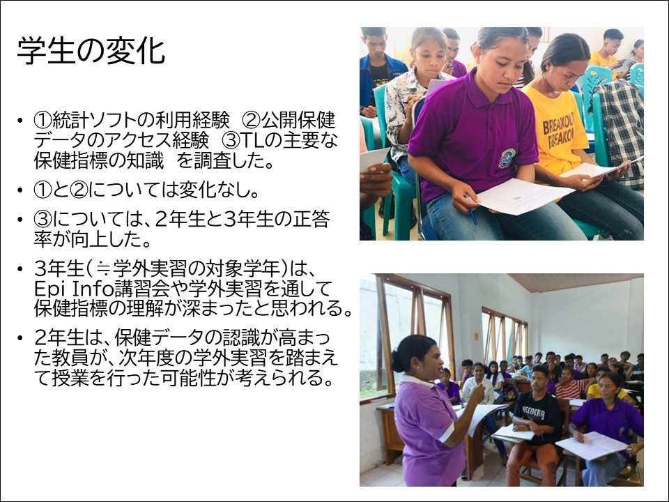 このプロジェクトを実施したことで、公衆衛生学部教員全般の保健データマネジメントの認識と知識が向上し、「学外実習を通して教育力を強化する」目的はある程度達成されました。その反面、保健データの分析や活用と、それに関する教育についてはまだ不十分です。教員からも、地域への展開等の要望が出ていました。地域保健データを活用してみんなの健康に寄与できるよう、引き続き支援できる方法を探りたいと思います。