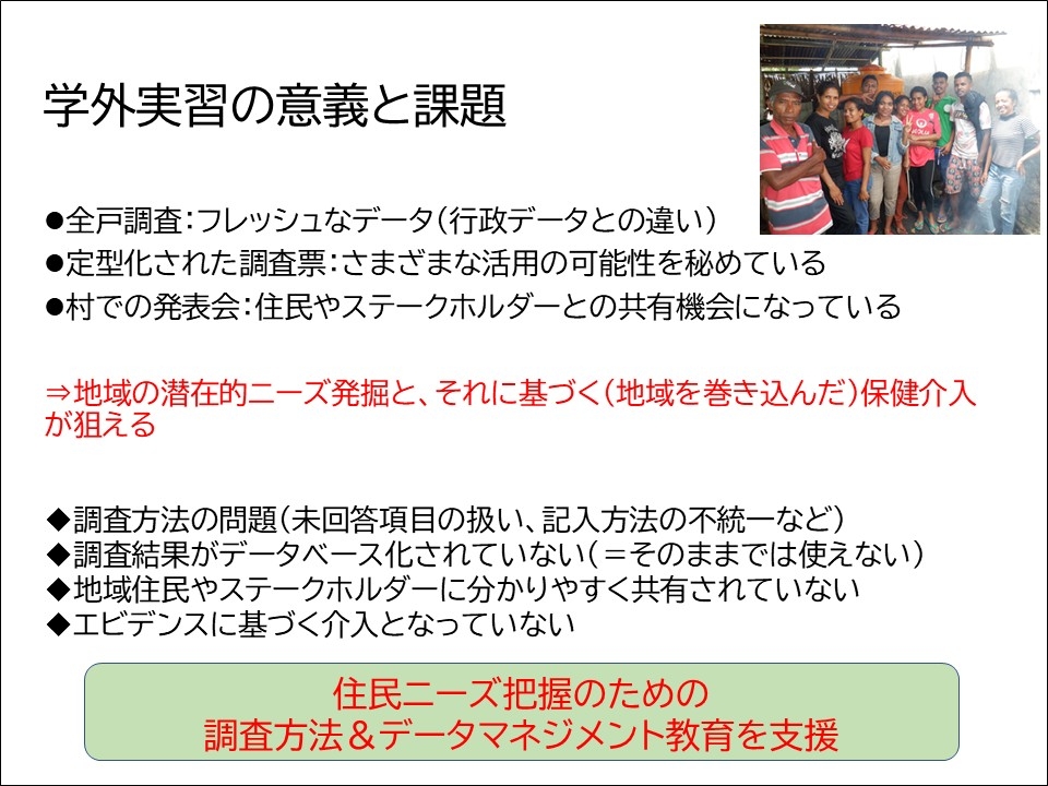 プロジェクトを実施するにあたり注目したのは、パーツ大学の学外実習(Field Learning Practice: FLP)です。学外実習は公衆衛生学部の特徴的な科目で、学生が8週間にわたってひとつの地域に住み込み、全住民の地域データを収集し、そのデータを根拠に地域の課題を発見→介入し、介入結果をモニタリングする、という一連の流れを体験学習するものです。学外実習は学生への教育効果のみならず、実習地域の住民にも共有される意義のある内容ですが、その反面、調査方法やデータ管理の不備、根拠に基づく介入ができていないなどの課題もありました。そこで、疫学調査支援ソフトを導入して学外実習データを分析しやすいように集積することと、実習成果を地域住民にも共有しやすいように冊子化することにしました。