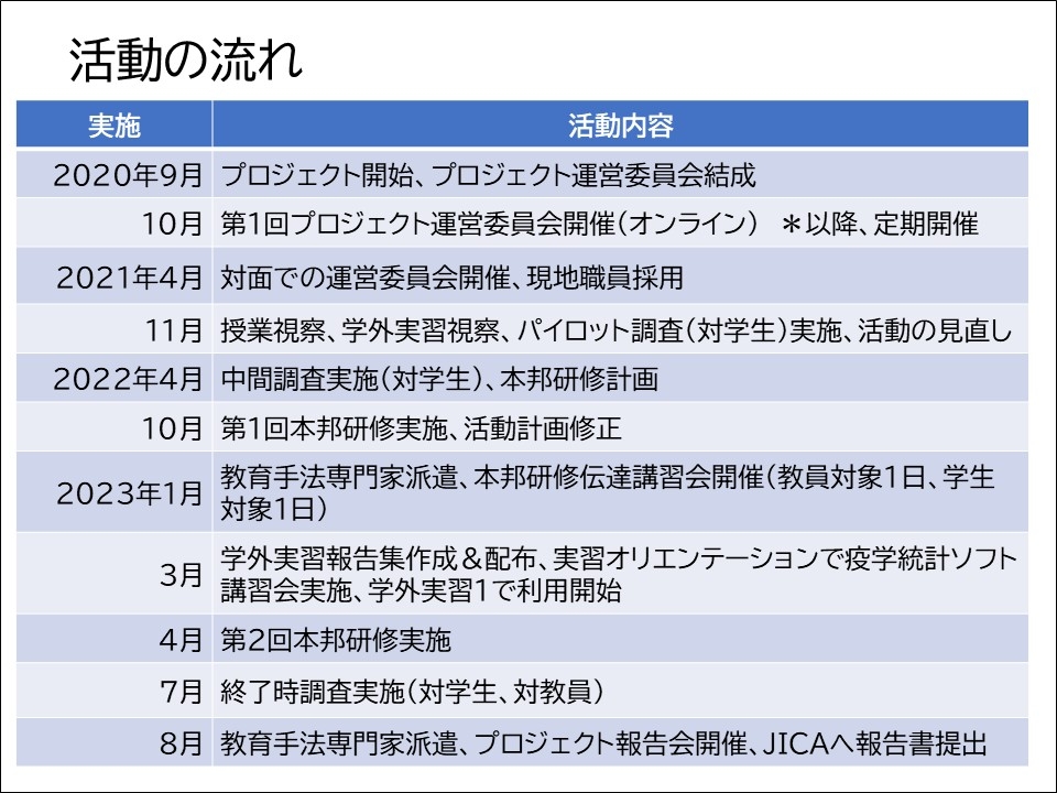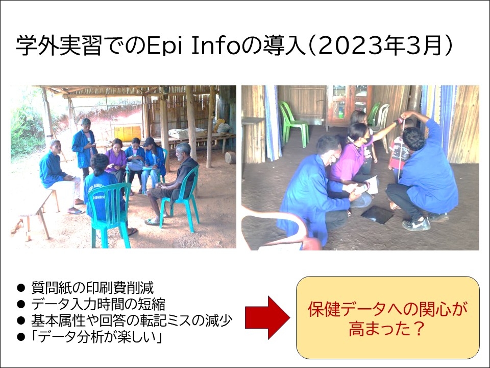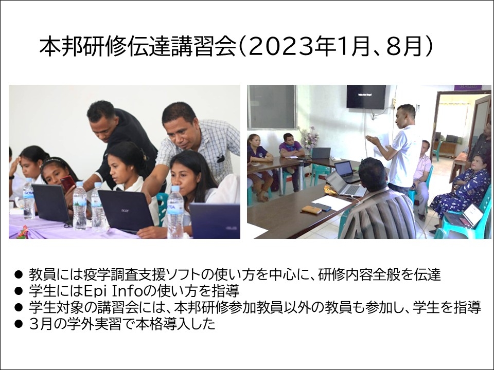 プロジェクトでは学部教員対象の本邦研修を2回実施し、伝達講習を通して全教員が学生指導に必要な知識と技術を積みました。そして、疫学調査支援ソフトの学外実習導入にこぎつけました。